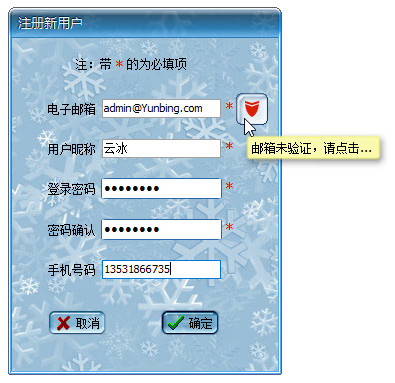 3、部分邮箱号可能会因系统的“反垃圾邮件”功能而拒收验证码邮件。此种情况下建议你将我们的发送邮箱服务号 YunBingSoft@163.com 加入邮箱白名单后再试。