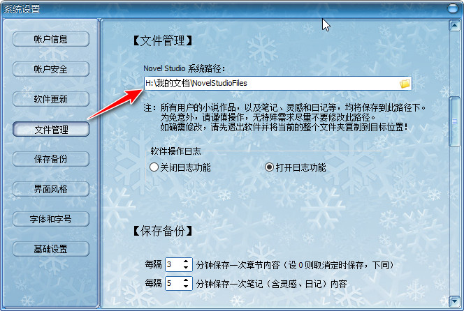 你可以在系统设置窗口中点击左侧“文件管理”导航按钮,快速跳跃至相应配置区,如下图所示,Novel Studio 系统路径就显示了你的数据文件夹位置。