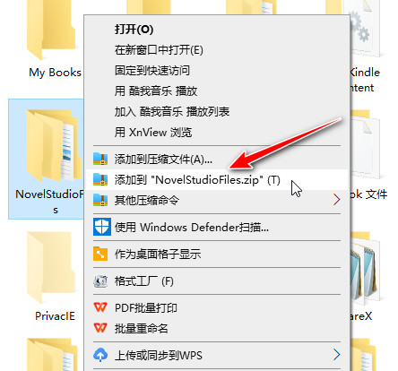 建议你每隔一段时间,定位到“我的文档”,然后右击这个“NovelStudioFiles”文件夹,将之打包备份,如下图(注:用户电脑安装不同压缩软件时菜单显示会有差异)——